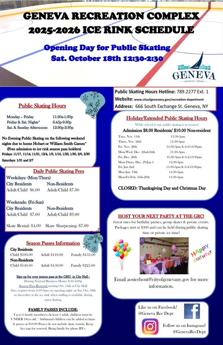 Geneva Recreation Complex opens seasonal ice skating with varied schedules and pricing.